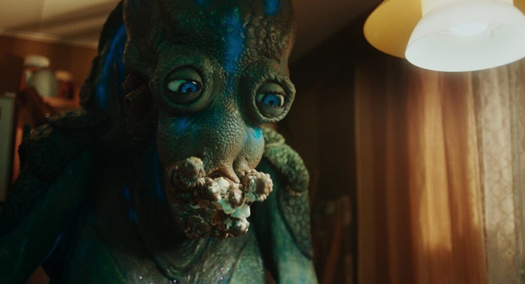 Le film a une esthétique travaillée, avec des décors colorés et propres à chaque personnage, tout en restant crédible avec la cité HLM dans laquelle tout ceci se passe. Les différents aliens sont en costumes et/ou marionnette, et même si on sent parfois le manque de moyen et les mouvements entravés des acteurs, je trouve que ça apporte grandement à l’esthétique du film. Ces effets pratiques sont particulièrement charmants et rendent indéniablement ces créatures réelles.